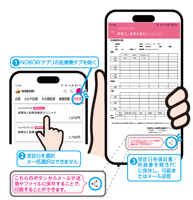 医療情報管理アプリ「NOBORI」の医療費後払いサービスをご利用いただくと、領収証や明細書のデジタル保存や印刷が簡単にできます。
