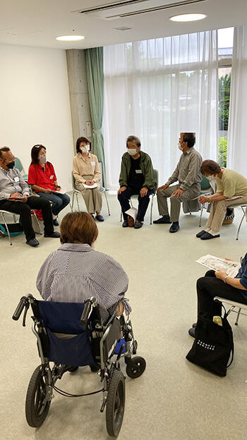 初回となる今回の参加者は、当事者と家族、支援者わせて27名、久しぶりに大勢の参加となりました。永田院長の挨拶に始まり、簡単なコグニサイズ(※)を実施後、グループに分かれて家庭での困りごとや近況報告など沢山の話題が飛び交いました。ご家族からは『悩むことも多いけど、困った時の相談場所があると知れて良かった』、『いつも家の中だけだから洋服に意識していませんでした。今日はお出かけなので、おしゃれしました。』等の感想を頂きました。